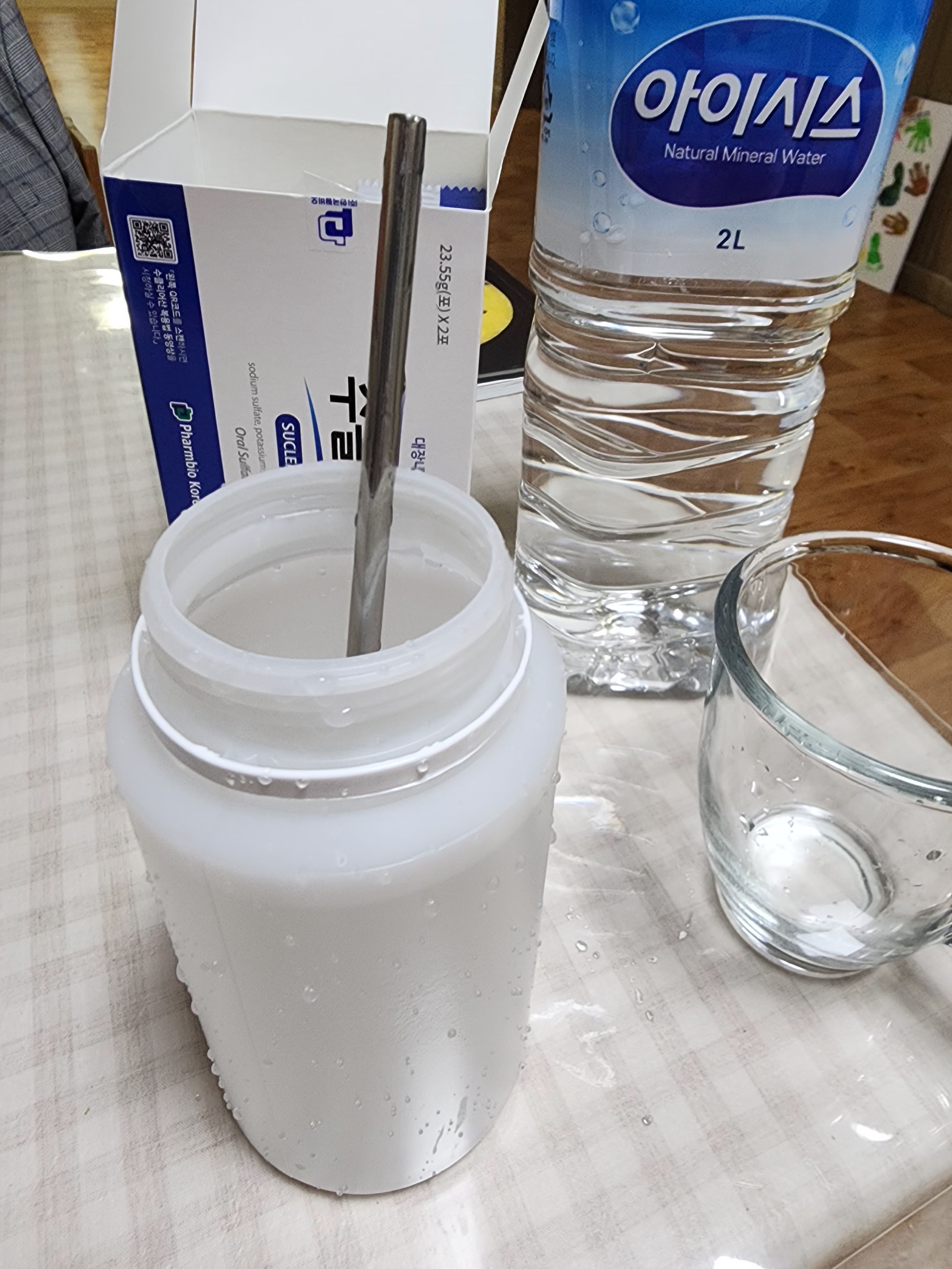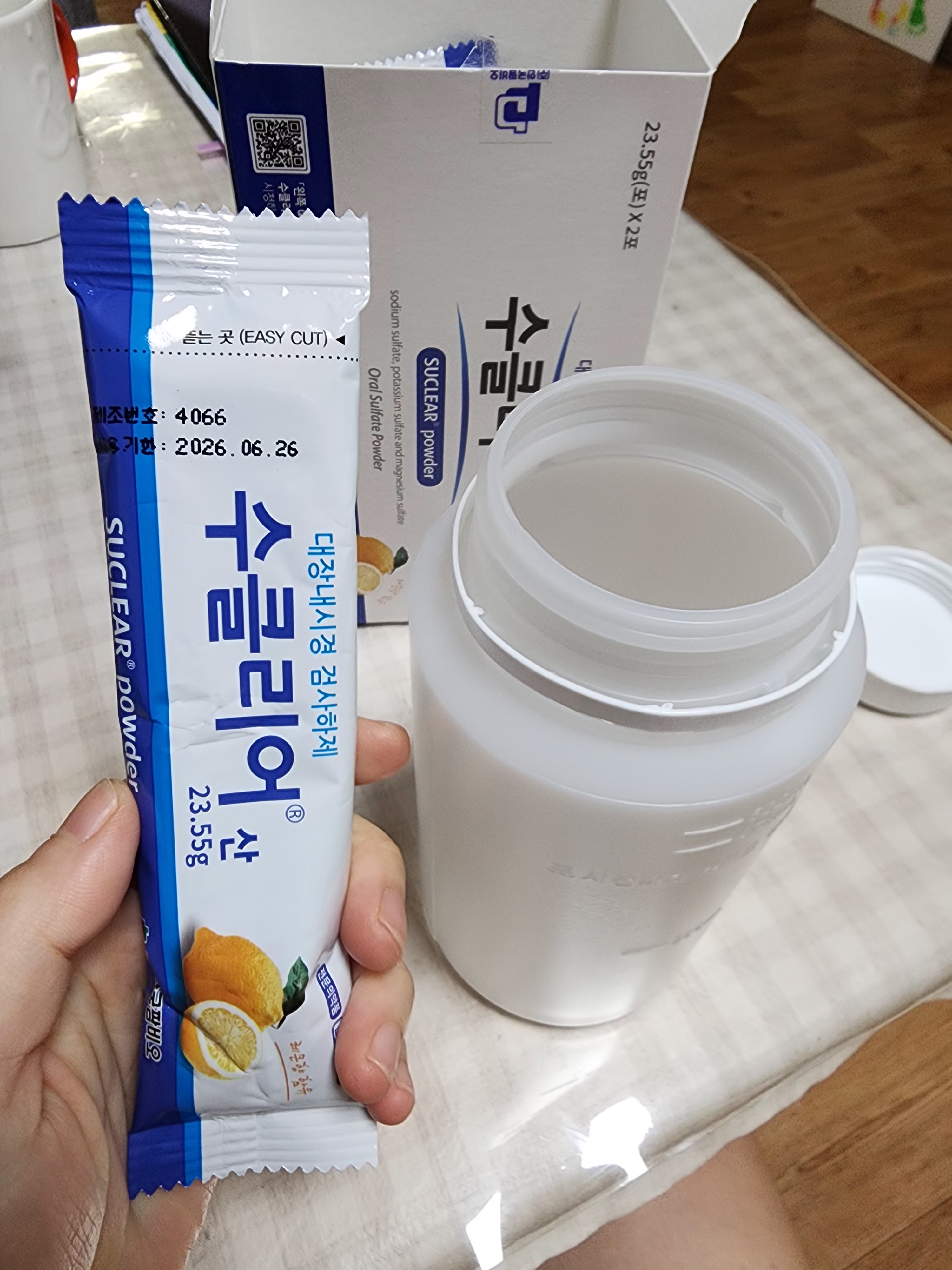 아침 약 순서는 1) 수클리어산 2) 엔도콜 3)물 2리터